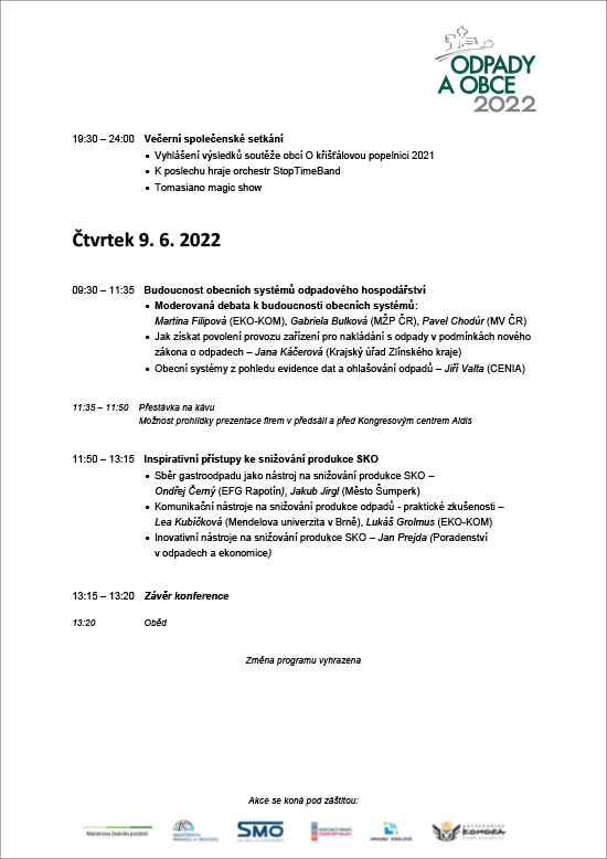 Konference ODPADY A OBCE 2022 se uskutečnila pod záštitou Ministerstva životního prostředí ČR, Ministerstva průmyslu a obchodu ČR, Svazu měst a obcí ČR, Asociace krajů ČR, Hospodářské komory ČR a města Hradec Králové. Jako vždy se na ní setkali zástupci obcí a měst, veřejné správy a odborné veřejnosti. Diskutovalo se na ní řada aktuálních témat ze světa odpadového hospodářství.